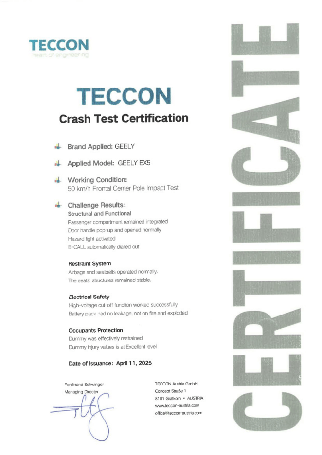 试验结果显示,撞击发生后,银河E5的四个车门均可顺利开启,E-CALL自动拨出救援电话,高压系统即时断电,电池无泄漏、无起火,气囊、预紧安全带全部正常工作,假人伤害值达到Euro NCAP刚性墙碰撞的优秀水平。这不仅意味着银河E5具备真实事故场景下的高强度保护能力,也标志着吉利在智能电动时代对整车安全系统的深入理解与极致追求。
