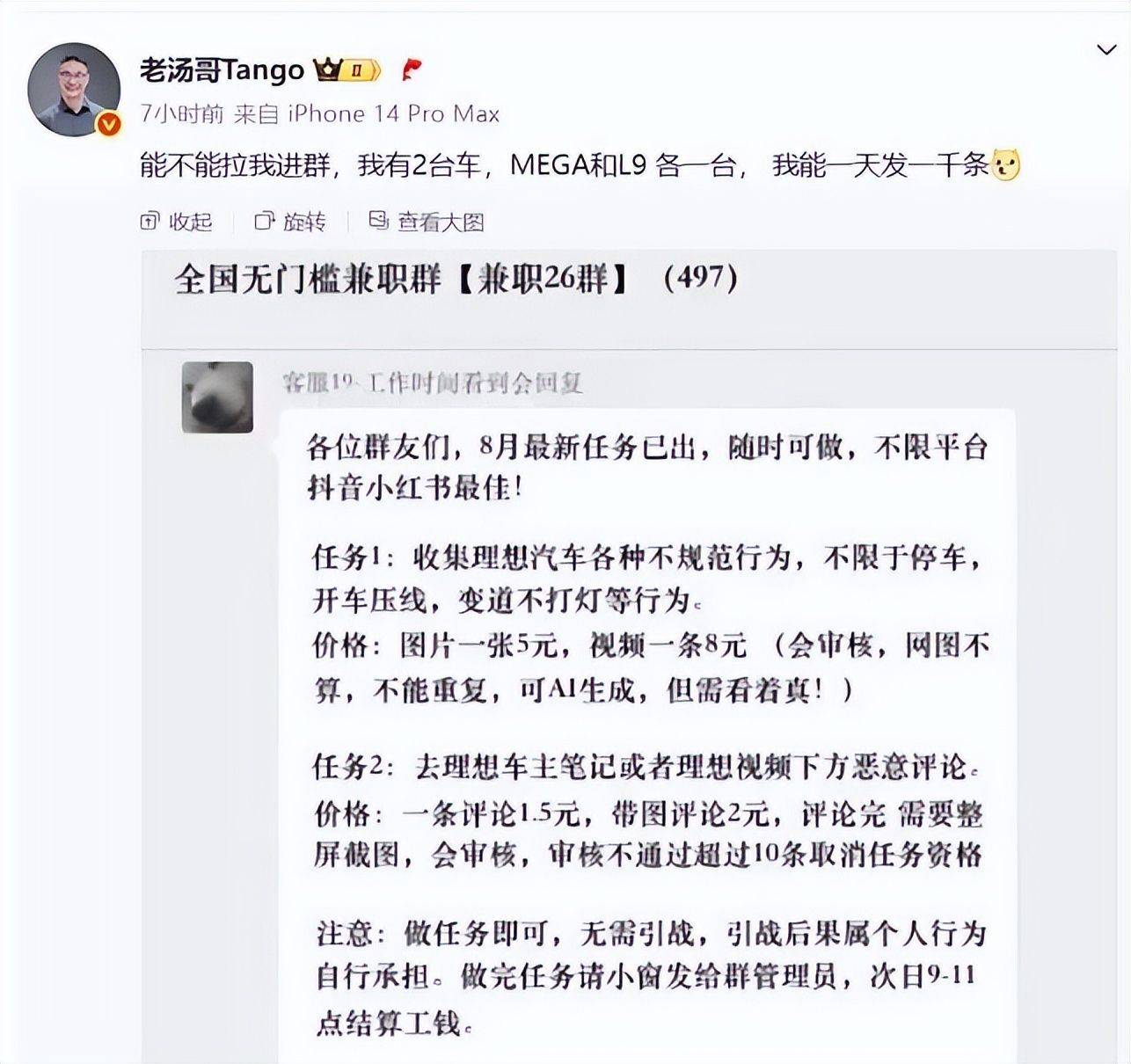 怒极而笑的理想汽车产品负责人汤靖晒出一张网络水军组织抹黑理想汽车的兼职群聊天截图,并调侃称,“能不能拉我进群,我有2台车,和L9各一台,我能一天发一千条。”